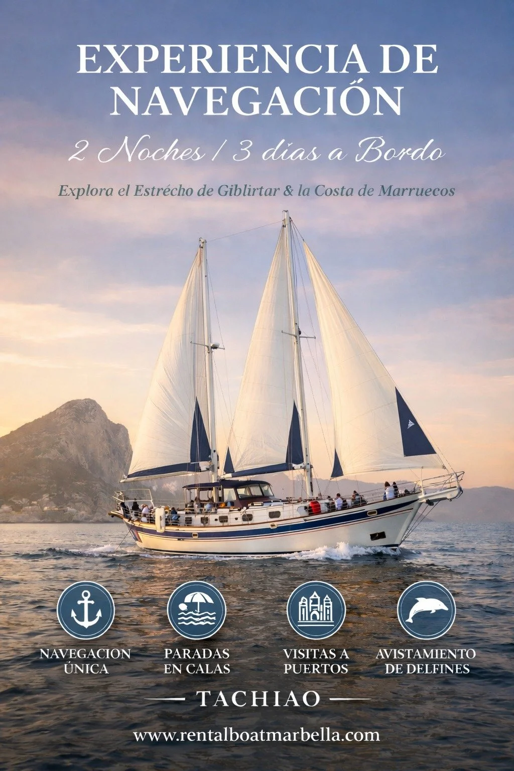 Descubre una exclusiva travesía a bordo del elegante velero clásico Tachiao de 17 metros. Navega por la Costa del Sol, Gibraltar, el Estrecho de Gibraltar, Ceuta y Sotogrande, con paradas en calas, baños en el mar y avistamiento de delfines.